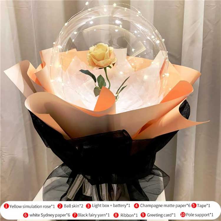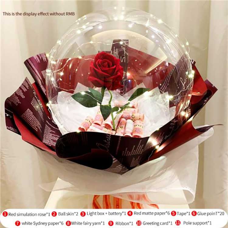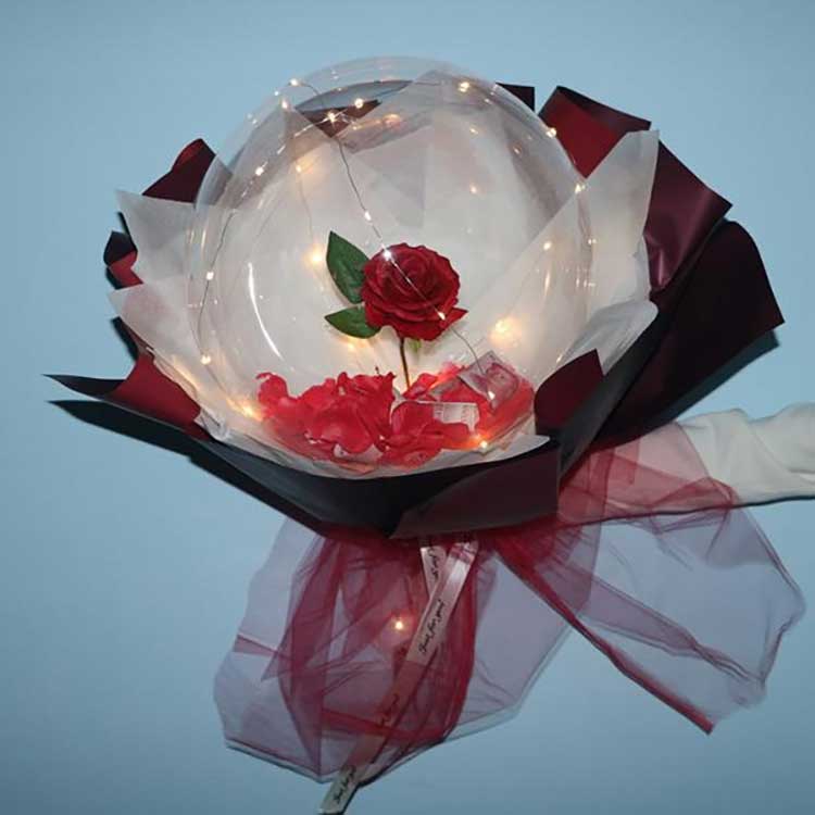 Балонот BOBOе неверојатно атмосферски:Со проѕирни BOBO балони, вградени рози и LED светла, комплетот создава светол и романтичен визуелен ефект. LED светлата исто така обезбедуваат мек сјај, што го прави суштински подарок за Денот на вљубените, годишнините, родендените, дипломирањето и Денот на мајката.