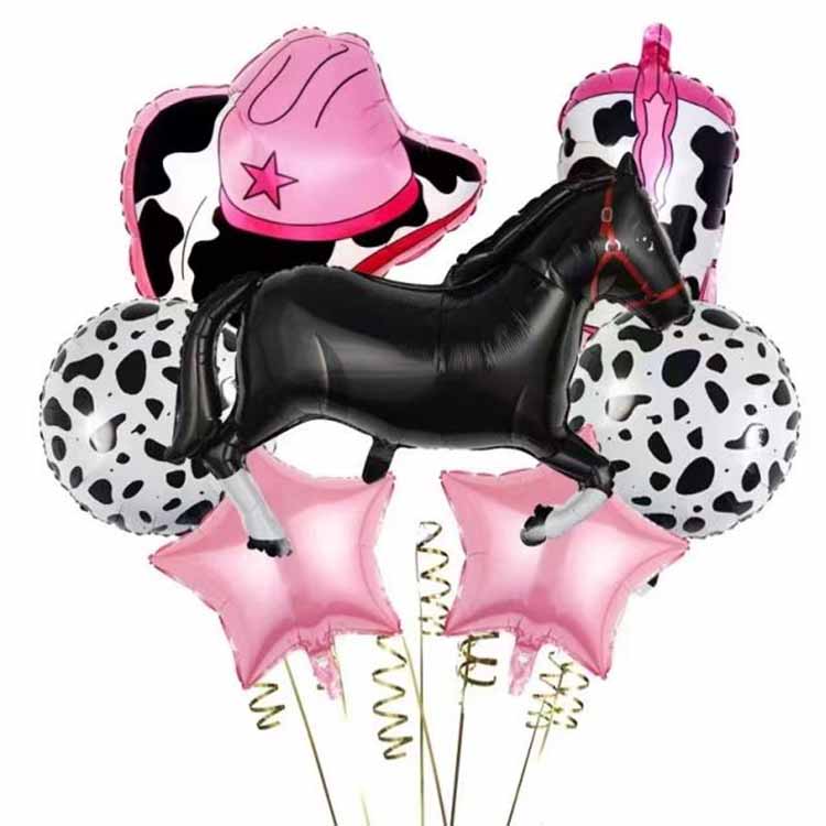 Со прецизни контури на линии и усогласување на боите, тие ги обновуваат контурите на мускулите и течените гриви на коњите кои трчаат, а вообичаените природни шеми на бои како што се кафеава и црна подобро се совпаѓаат со вистинската слика на коњите. Некои балони од фолија со каубојска тема дури додаваат метални бои како сребрена и златна за да го зголемат визуелното влијание; кравата шема е кружна, на неа се испечатени црно-бели крави, а некои стилови додаваат тродимензионални украси како што се мали ѕвончиња и плусsh опашки под балоните од алуминиумска фолија, кои се и слатки и имаат рурален стил и се многу популарна тема за каубојски активности за семејствата.