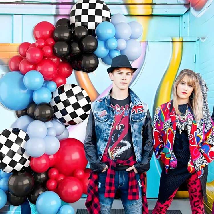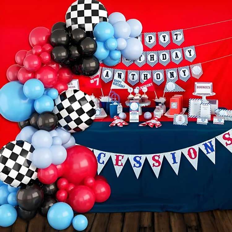 Комплетот за украсување на балон со лак за тркачки теми се состои од 88 компоненти. Вклучува 80 балони од латекс, 6 балони од фолија, 1 ланец за балон и 1 леплива точка.