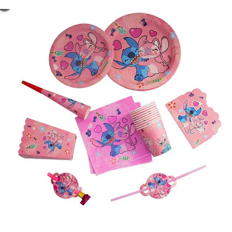 Комплет чинии за еднократна употреба Stitch ги вклучува следните производи: чинии од 7 инчи (10 парчиња/торбичка), чинии од 9 инчи (10 парчиња/торба), салфетки (20 парчиња/торба), знаменца (10 парчиња/торба), вреќи за повратни подароци (10 парчиња/торба), кутии со пуканки/торбичка (6 парчиња). (6 парчиња/торбичка), хартиени капи (6 парчиња/торбичка), хартиени чаши (10 парчиња/торбичка), рогови (6 парчиња/торбичка), сламки (10 парчиња/торбичка), картички за покани (10 парчиња/торбичка), маски (10 парчиња/торбичка), лажици, прибор за јадење/торбичка (10 парчиња) Сетот содржи 17 различни типови на производи. Клиентите можат да изберат да го купат целиот сет или да изберат само дел од артиклите за да ги задоволат нивните потреби.